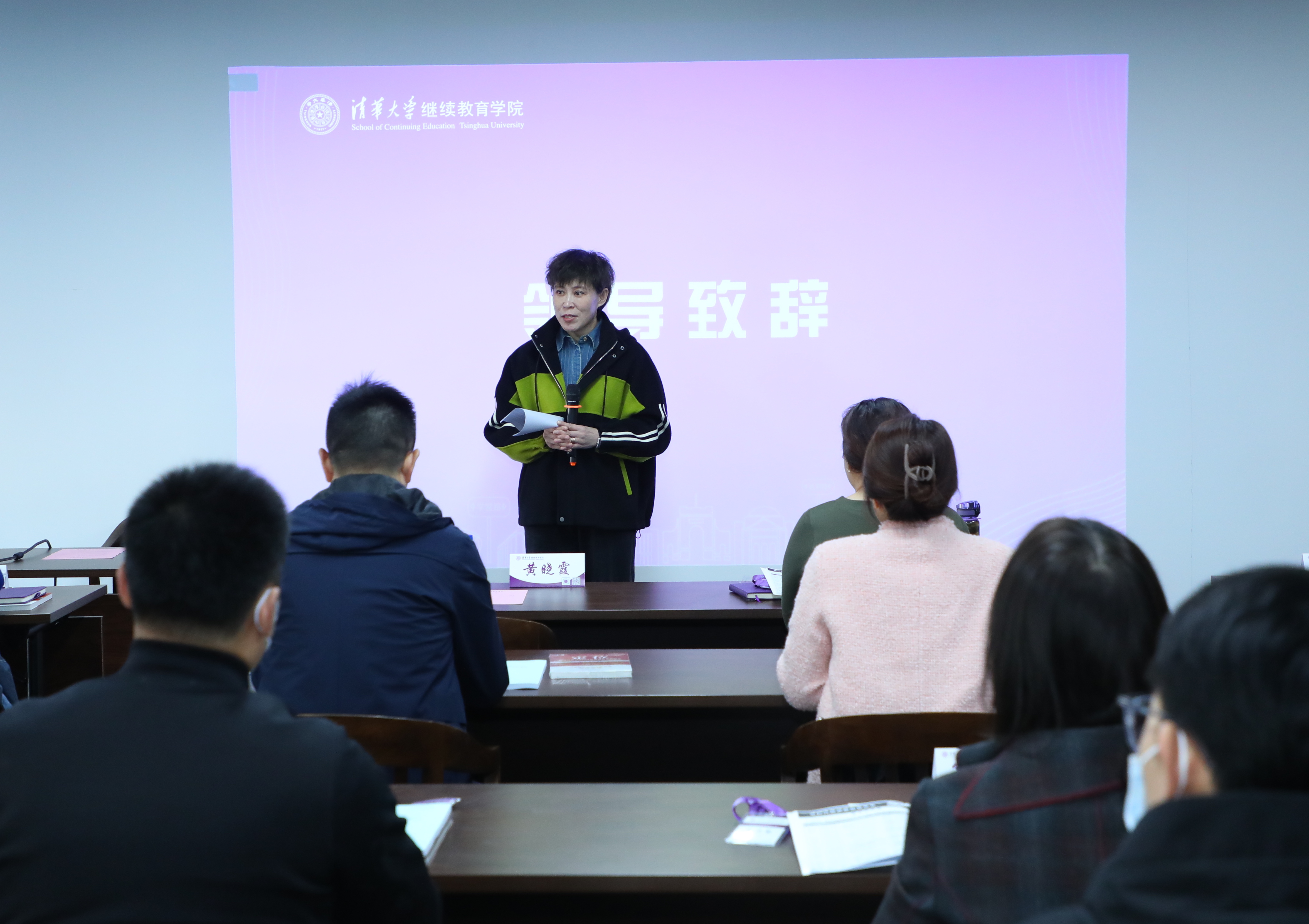 黄晓霞副院长在致辞中对全体学员的到来表示欢迎,她赞扬了学员们坚持学习的精神。她说,希望学员们有效利用集中短暂的学习时间,主动分享和充分交流;体验学习的快乐,建立终身学习的理念;在了解清华精神的实质的同时,将企业实践和大学学科专业知识相结合。